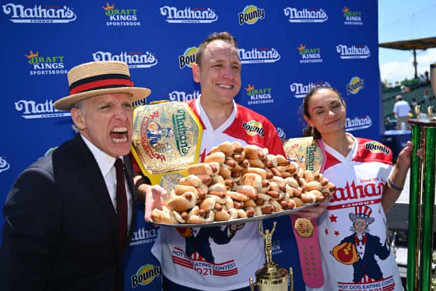 Joey Chestnut Eats Record 76 Hot Dogs In 10 Minutes To Win Nathan S Famous Title Us Sports The Guardian